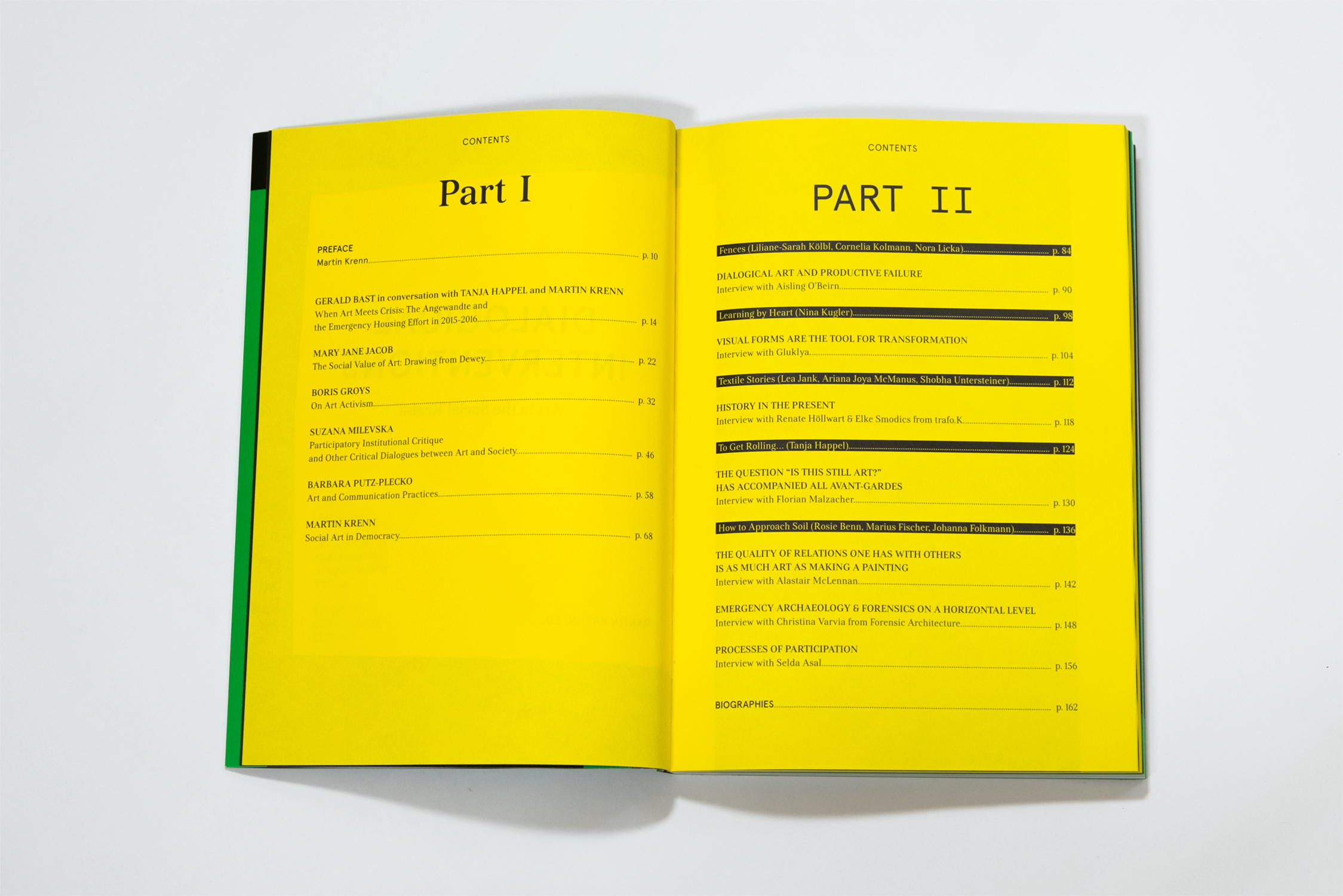 Publication which evolves around the practice of dialogical art. Part 1 of the 168 pages book consists of essays by Suzana Milevska, Martin Krenn, Boris Groys and many more. Part 2 is comprised of interviews and student projects presented with collages.